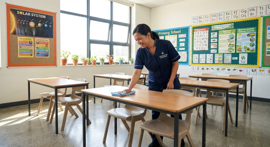 Choosing a school cleaning contractor? Here's what actually matters — DBS checks, safeguarding training, term-time schedules, and quality verification.